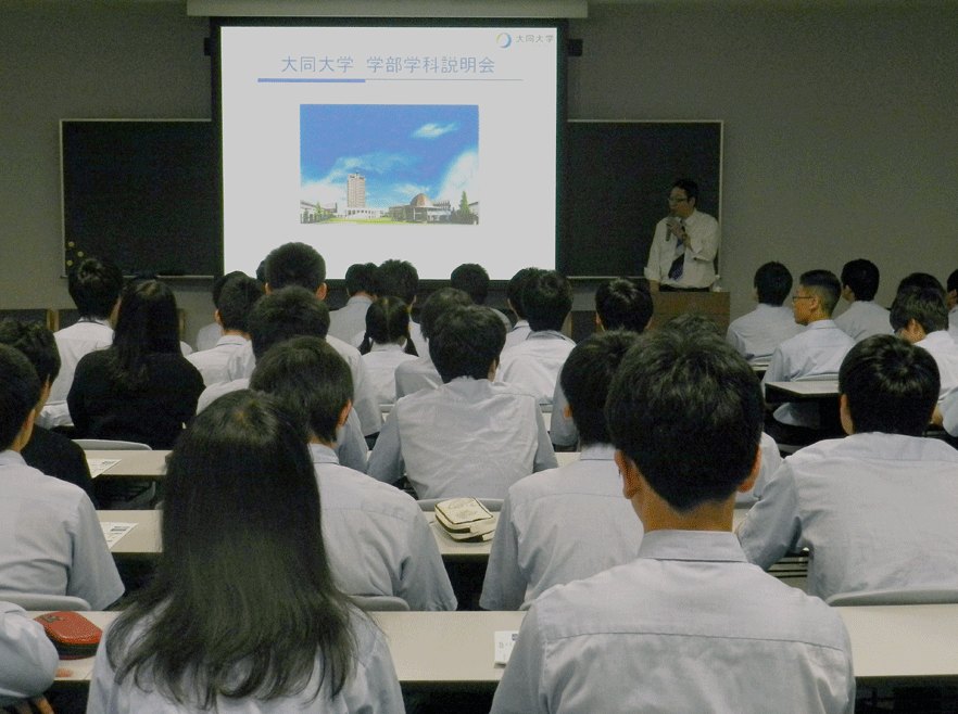 5月25日(月)、大同大学への進学を希望する3年生に対して、大同大学より入試部長の渡邊慎一教授に来ていただき学部学科の説明をしていただきました。大同大学の学部学科の構成、大学での学習支援体制、資格取得支援体制、就職の実績、入試の説明などを詳しく説明していただきました。