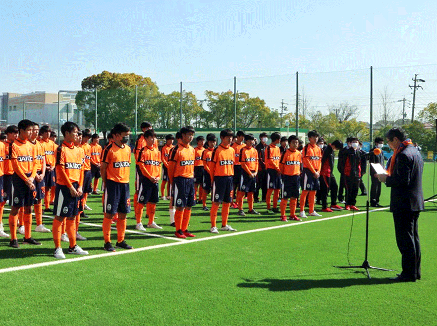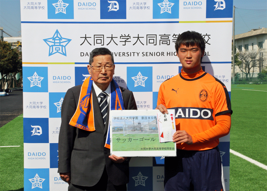 当日は、学校関係者、大同大学同窓会長、大同高校同窓会長、生徒会・サッカー部・陸上競技部の生徒が参加しオープンを祝いました。このグランドの人工芝化には大学同窓会から多大な支援をいただきました。また、高校の同窓会からは、サッカーゴール一対を記念品として寄贈していただきました。