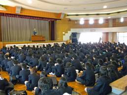美浜少年自然の家の八谷所長の話に耳を傾ける生徒 |